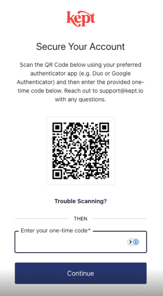 To keep your Kept account secure, you may be prompted to provide an authentication code during login. We recommend using an authenticator app, such as Google Authenticator, which is available for download on the App Store and Google Play.