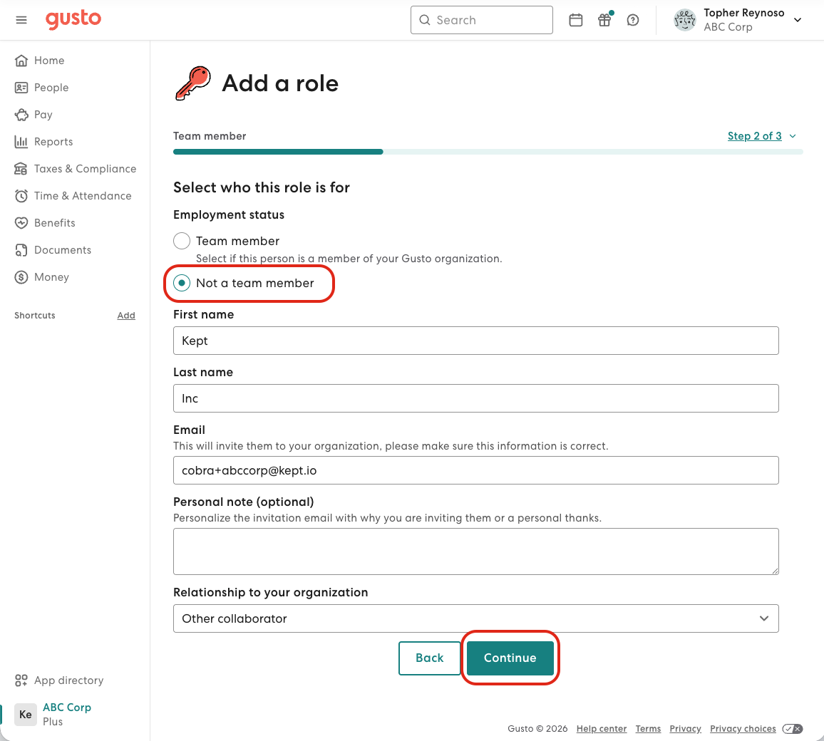 To integrate your Gusto account with Kept, follow the instructions below to create an admin account for us. NOTE: Only a company admin (not a broker account) can add a new admin. You may need to share this URL with the employer's benefits admin in order to complete this process.